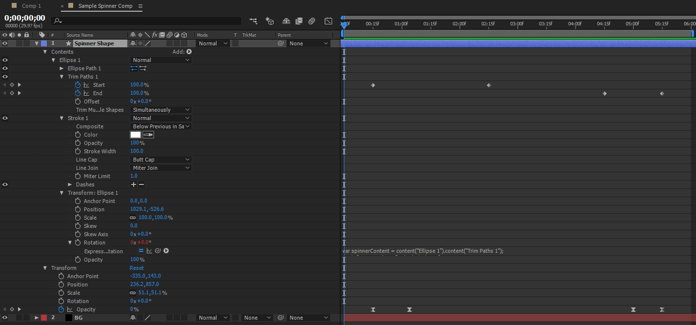 You may need to update some of the names, "Ellipse 1" should be the name of the ellipse shape that you created and "Trim Paths 1" should be the name of the trim paths adjustment that you added, if the names are different in your project, just change them accordingly.
