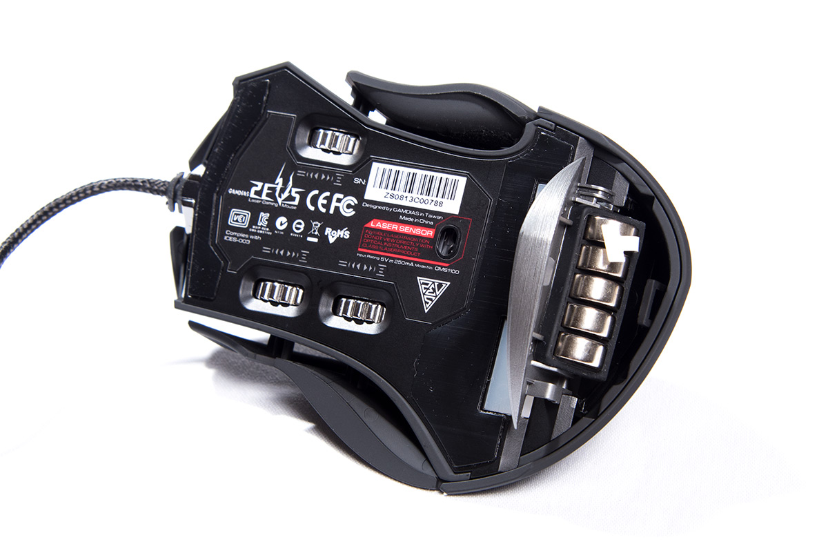 This leads into the available adjustments on the Zeus. There are 3 adjustment wheels on the bottom that move side panels in and out. This allows you relatively easily adjust the mouse for the size and shape of your hand. It's not something that I've ever had on a mouse before, so it The more aggressive designed mice generally take a little longer to get used to definitely took some playing around to find the right spot for everything. Also included with the mouse are 2 different size inserts that fit in spaces between the adjustable areas that act as spacers and just add a little more comfort to the mouse when used. Along with all of these things, the mouse also has a weight compartment in the bottom that hold 5 x 4.5g weights for adjusting the overall weight of the mouse. The compartment that holds the weights is a little wonky in that if you push it in at a weird angle it stops it from closing, so you have to hold your mouth right to get everything to line up. So if you can't get the door closed, don't force it you need to pull the door out towards the back and bottom of the mouse and the little stops should align so it will close.